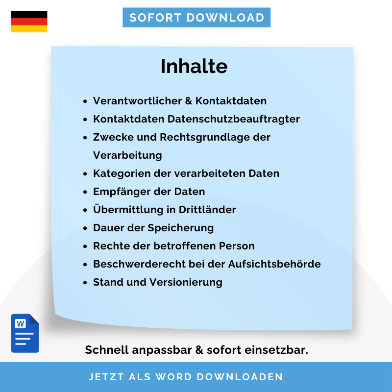 - Enthalten: Verantwortlicher, Datenschutzbeauftragter, Rechtsgrundlagen, Datenkategorien, Empfänger, Speicherdauer, Rechte der Betroffenen, Aufsichtsbehörde