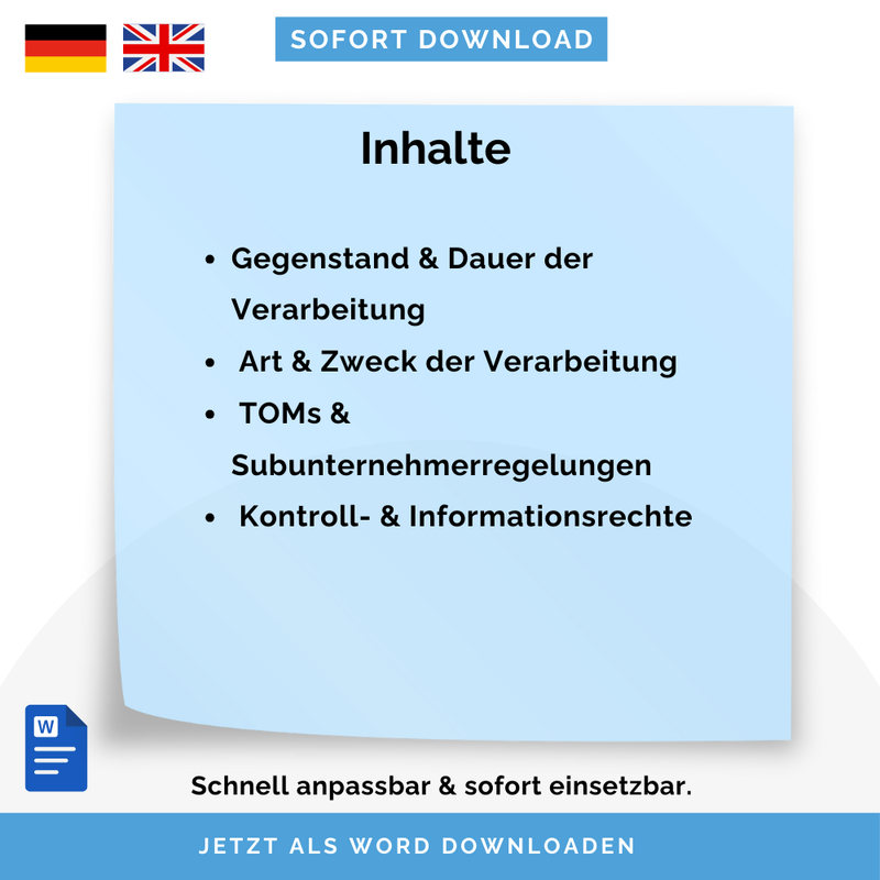 - Enthaltene Punkte u. a.: Gegenstand & Dauer der Verarbeitung, Art & Zweck der Verarbeitung, Pflichten & Rechte von Verantwortlichem & Auftragsverarbeiter, Technische & organisatorische Maßnahmen (TOMs), Subunternehmerregelungen, Kontroll- & Informationsrechte