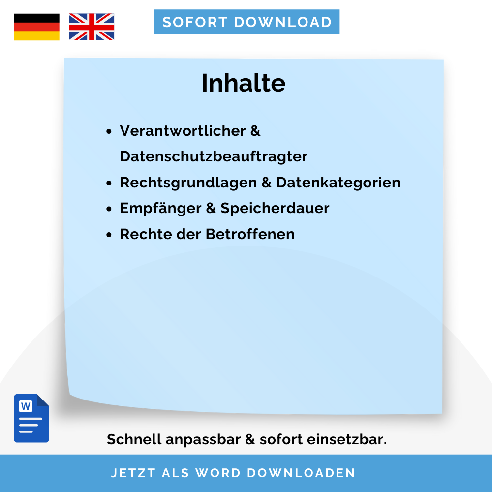 - Enthalten: Verantwortlicher, Datenschutzbeauftragter, Rechtsgrundlagen, Datenkategorien, Empfänger, Speicherdauer, Rechte der Betroffenen, Aufsichtsbehörde