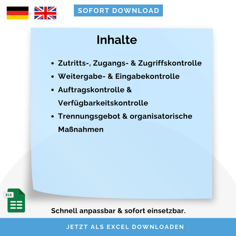 - Enthält Beispiele für Zutrittskontrolle, Zugangskontrolle, Zugriffskontrolle, Weitergabekontrolle, Eingabekontrolle, Auftragskontrolle, Verfügbarkeitskontrolle, Trennungsgebot, Organisatorische & übergreifende Maßnahmen